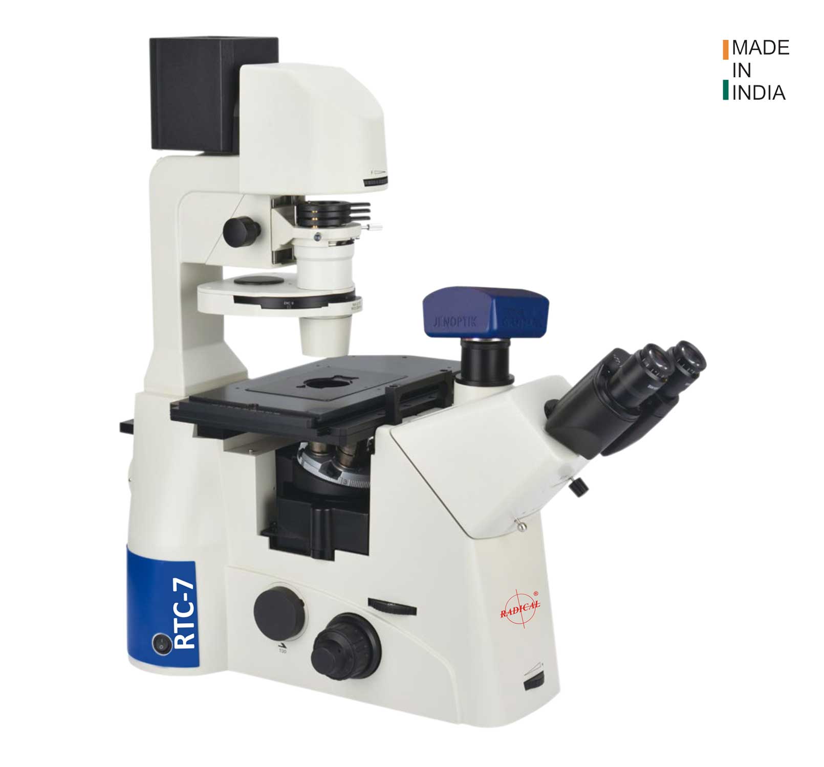 RTC-7NXF having NIS60 optical system features Retroverted illumination, coded nosepiece, turret phase, turret fluorescence, median lens, camera adaptor on both sides, etc is latest offering from the House of RADICAL is suitable for broad range of observation methods. In addition to conventional contrast, microscope is versatile in observation methods, including fluorescence, Phase Contrast, DIC, and Hoffman Modulation Contrast.