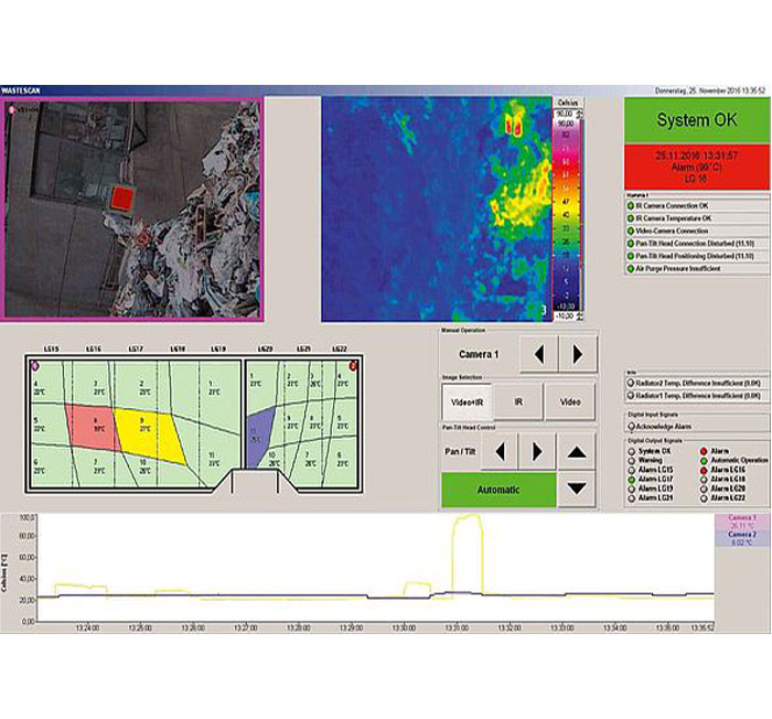 Waste incineration plants are subject to fire safety regulations since it can cause danger to environment and its local residents. Thus, InfraTec offers its thermographic solution WASTE-SCAN in particular with regard to the 17th German federal immission protection ordinance for early fire detection and fire fighting. It is a consistent further development of the FIRE-SCAN system for the special needs in the waste and power industry on the operation of waste bunkers. The application of WASTE-SCAN reduces the danger of fire in waste bunkers and, therefore, the escape of toxic gases. A fully remote-controlled solution from the bunker control room or the crane cockpit enables a flexible work for plant operators. When necessary, they are additionally supported by a camera for a better orientation. Critical temperature areas can be displayed directly in the visual image. The infrared camera itself is enclosed in a robust housing with a blow-off system for the camera lens and, therefore, can also operate under adverse ambient conditions.