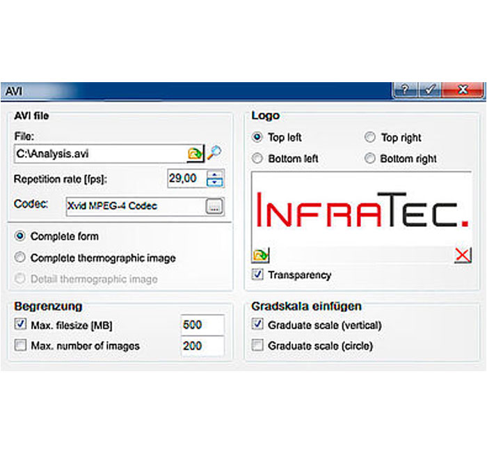 This module of the thermographic software IRBIS® 3 permits the automatic export of thermal image series or several single images into descriptive AVI movies. It is also possible to define a partial area of the thermogram, which is designated by the user, for the AVI export. The thereby gained sequences can be played on any commercial media player.